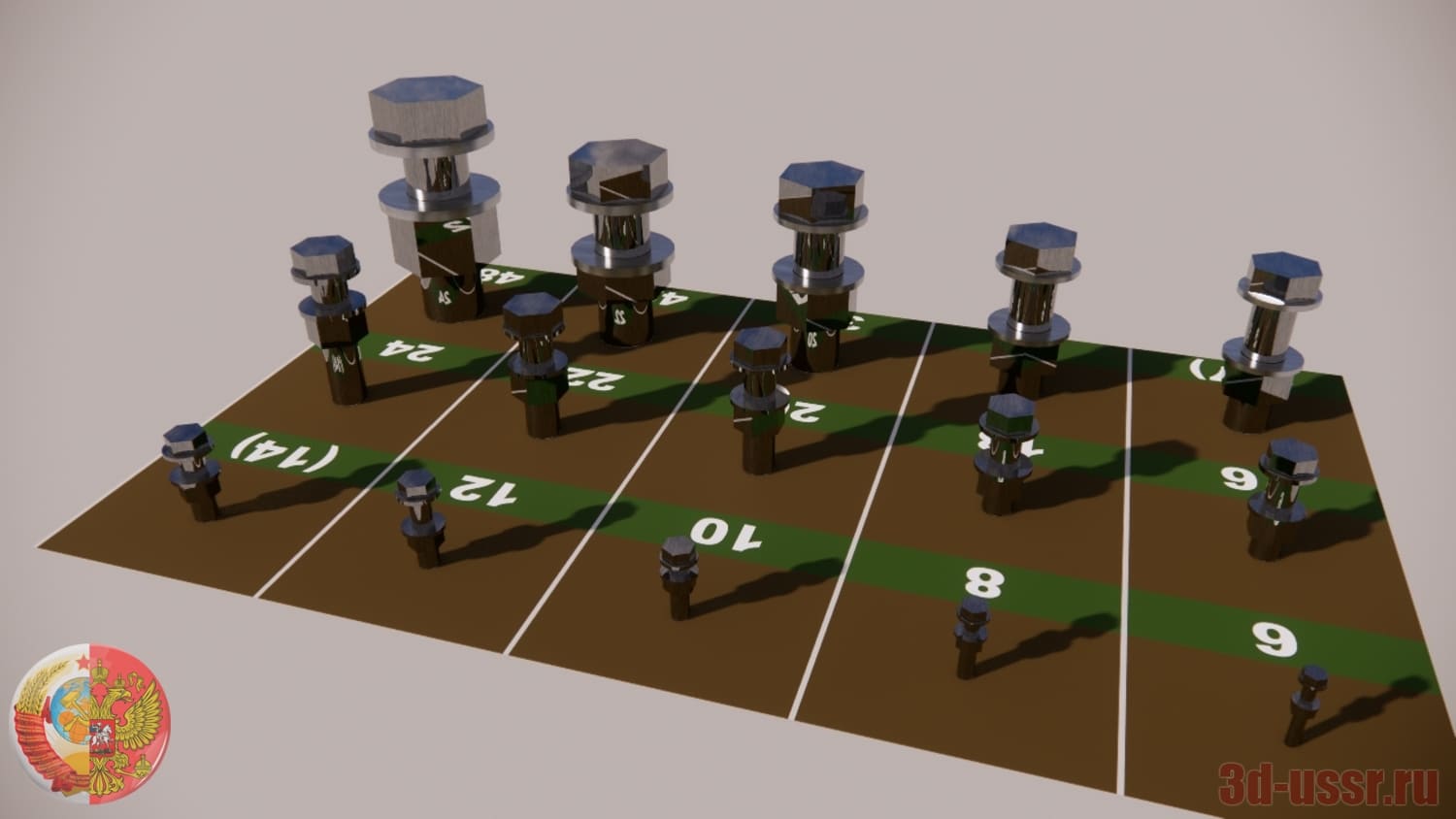 3d-модель болтов с шестигранной гайкой по ГОСТ 7798-70 диаметром от 6 до 48 мм. В комплекте идут также и шайбы к ним.