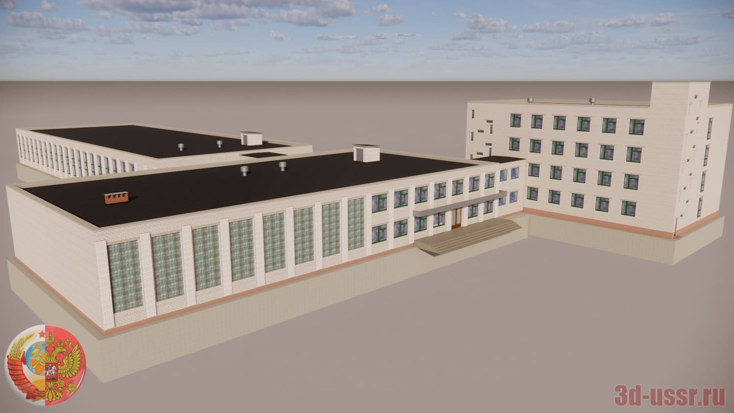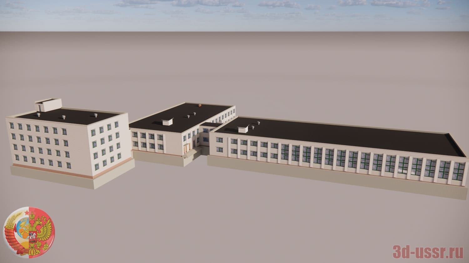 3d-модель технического училища СССР, проект не определен, состоящего из трех корпусов. Смоделировано по фотографиям, видам со спутниковых карт. Распространено в городах Челябинской области.