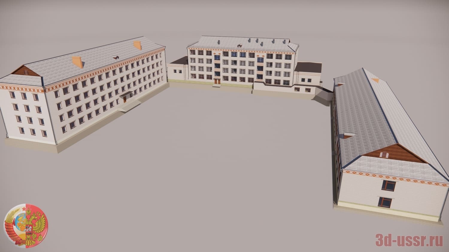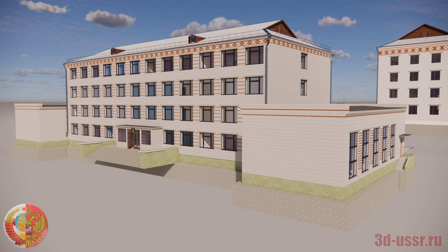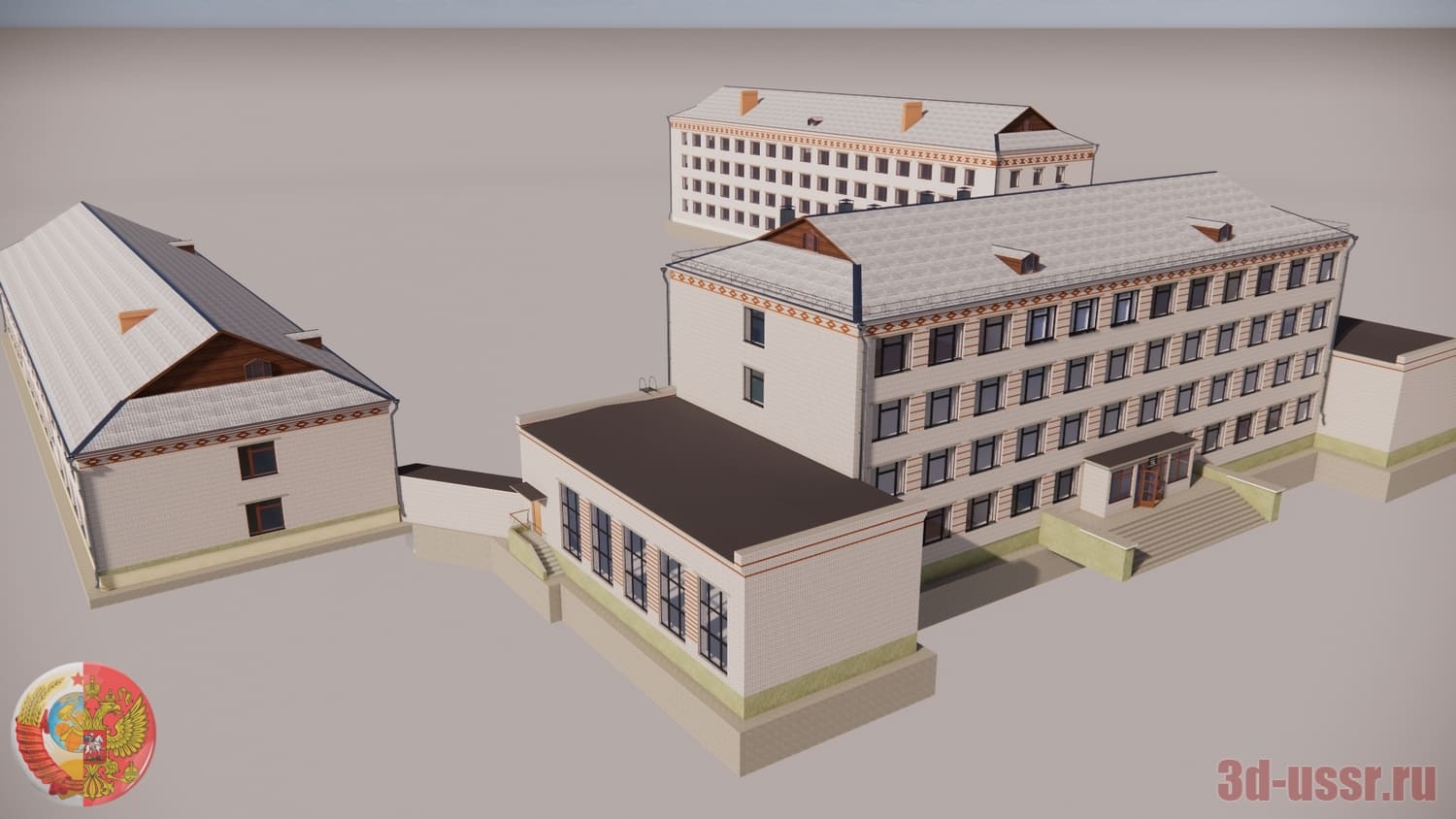 3d-модель профтехучилища проекта 2-03-18/58 времен СССР на 600 учащихся. В дополнение к нему прилагаются соединенные переходами здания столовой и лаборатории с мастерской.