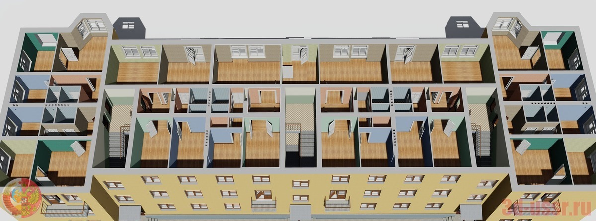 3d-модель сталинки 253 серии выполнена по чертежам в соответствии с реальностью. Внутренние элементы (окна, двери, лестницы, электрика) выполнены отдельными группами, компонентами и воссозданы по отсканированным соответствующим чертежам и проектам тех лет. Легко подвергается редактированию, можно менять число этажей, подъездов, поменять окна, двери и прочие элементы по желанию пользователя.